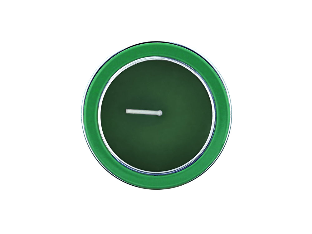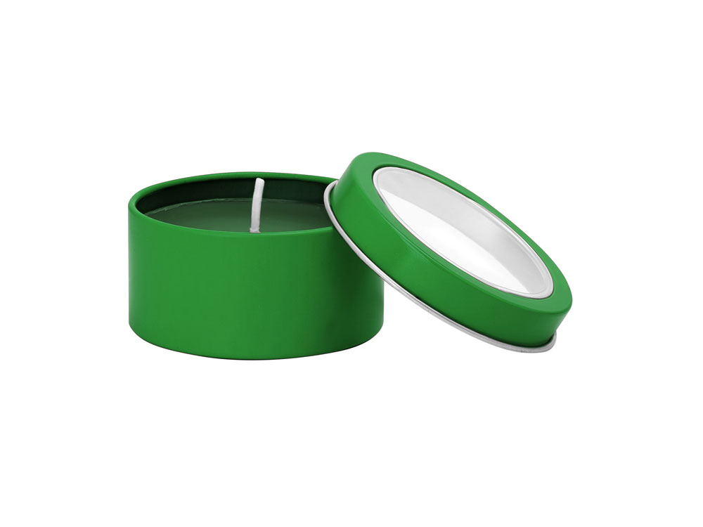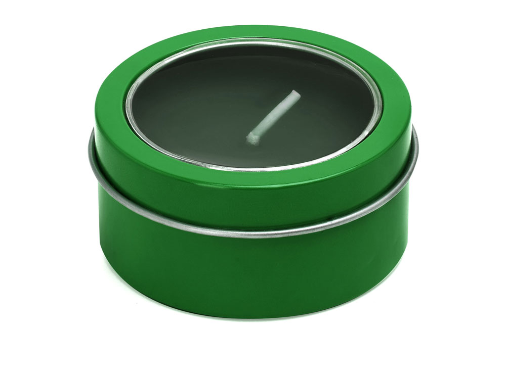 Ароматическая свеча с запахом ванили в металлическом круглом подсвечнике с крышкой с прозрачным окошком. Цвет свечи в тон подсвечника. белый фитиль