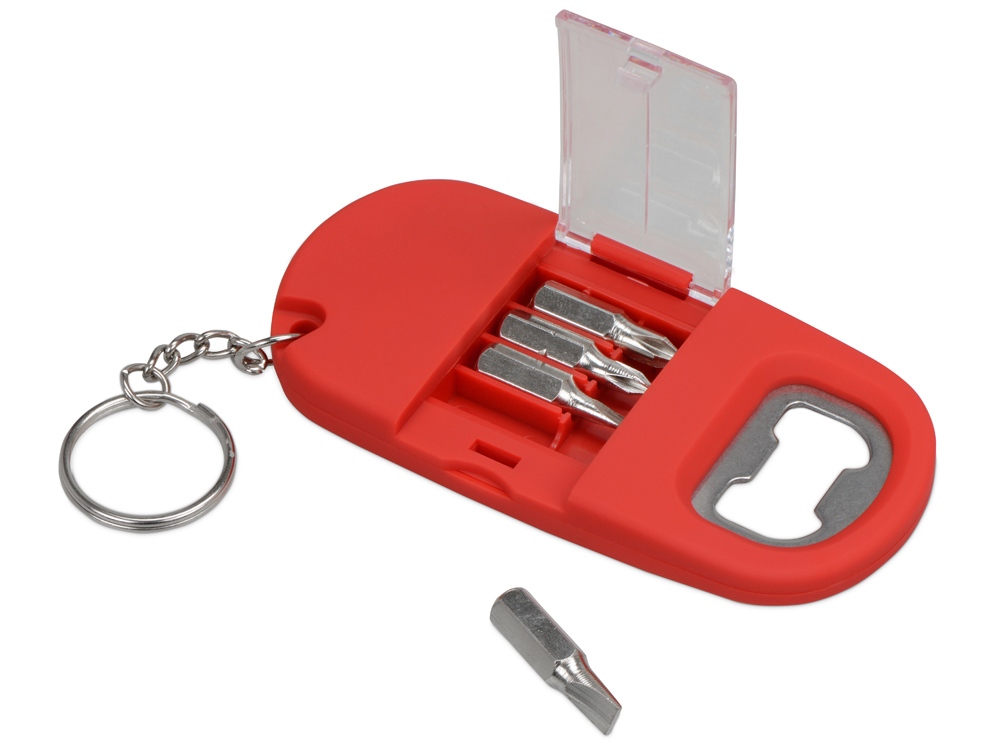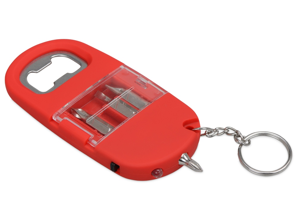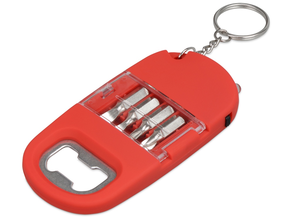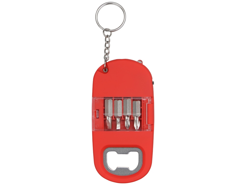 Брелок включает в себя 2 плоские и 2 крестообразные насадки, прочную металлическую открывалку и небольшой фонарик. Корпус сделан из плотного пластика с мягким покрытием soft-touch. Встроенный фонарик позволяет подсвечивать рабочую зону.