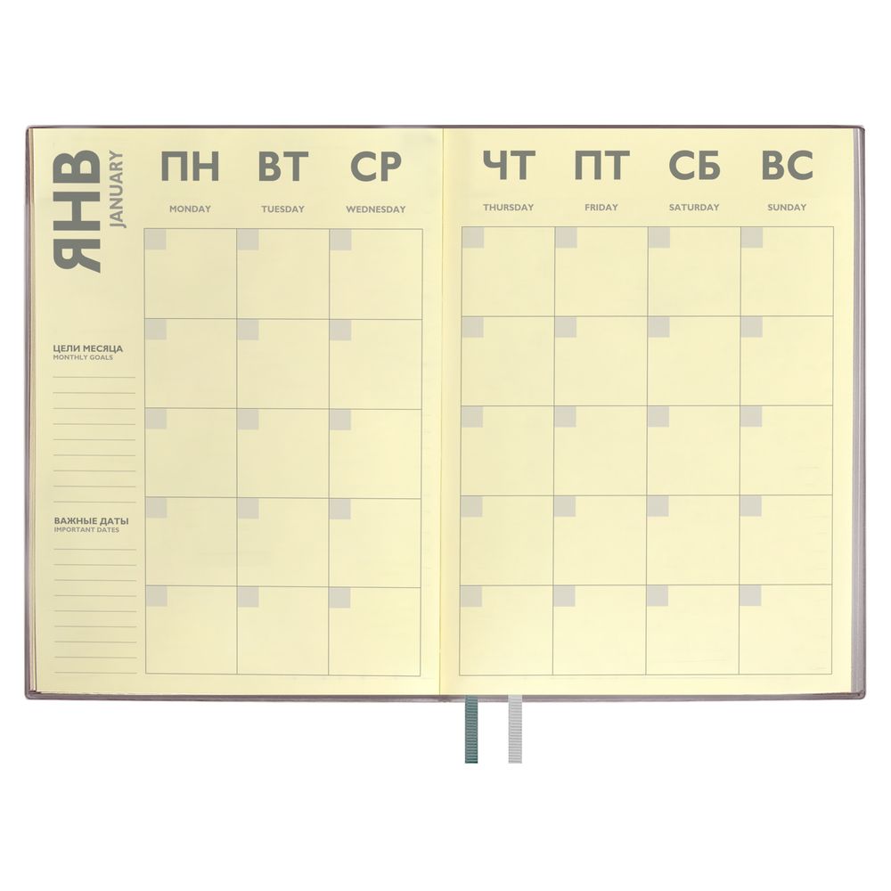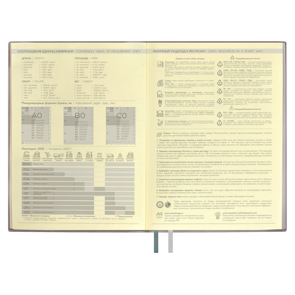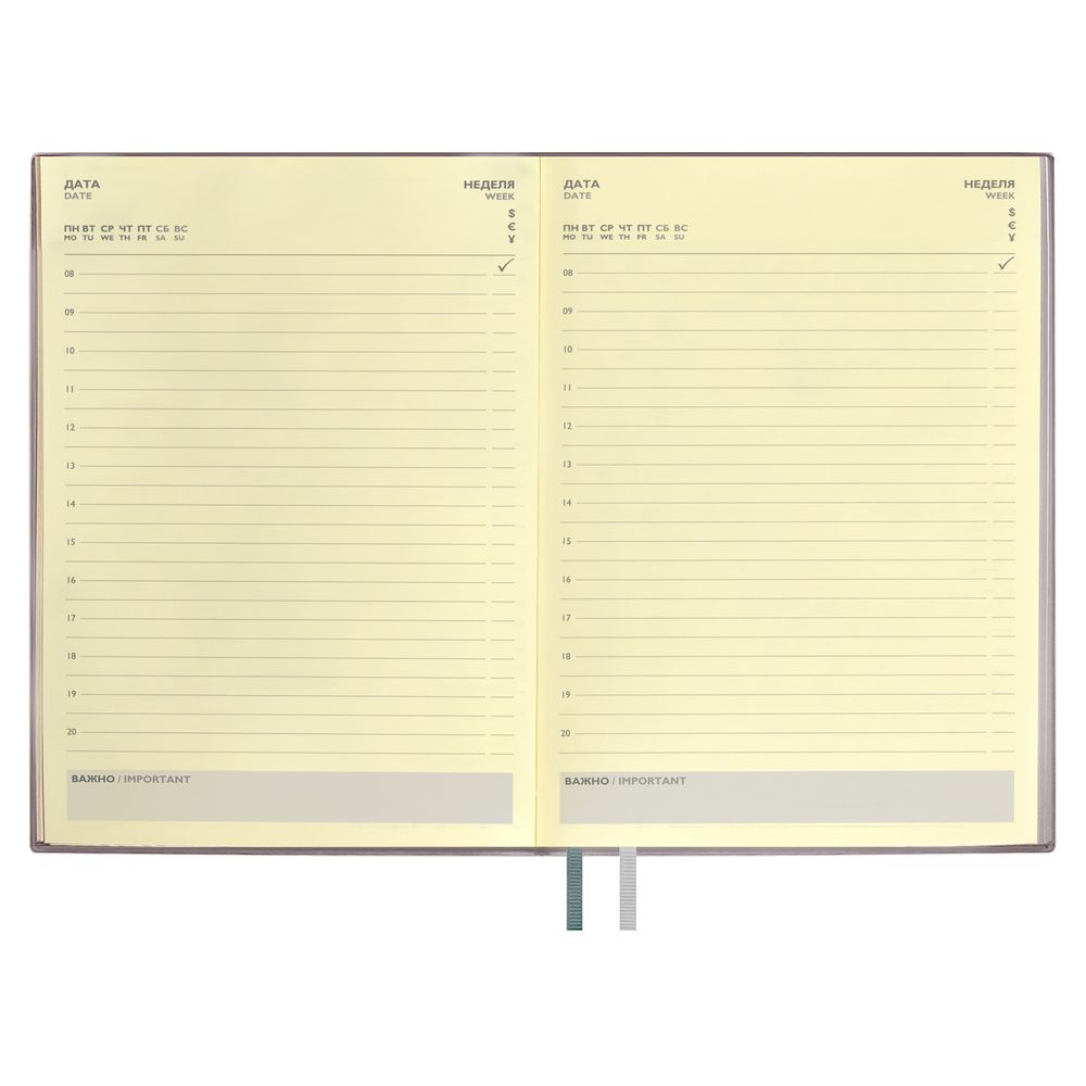 Ежедневник с гибкой обложкой и закладкой из искусственной кожи, дополнен капталом и двойным ляссе.