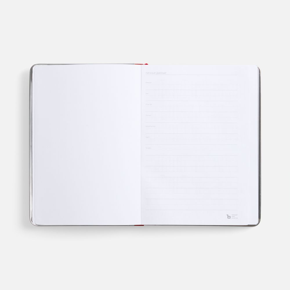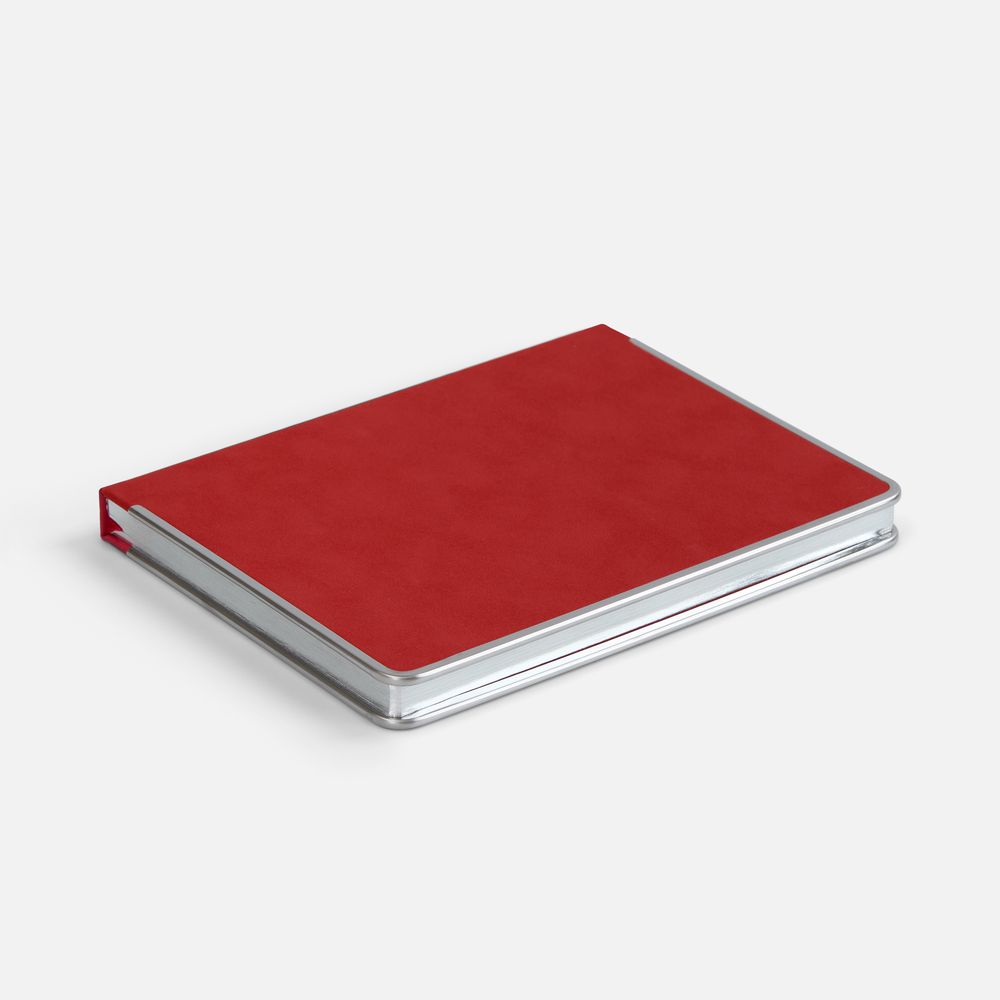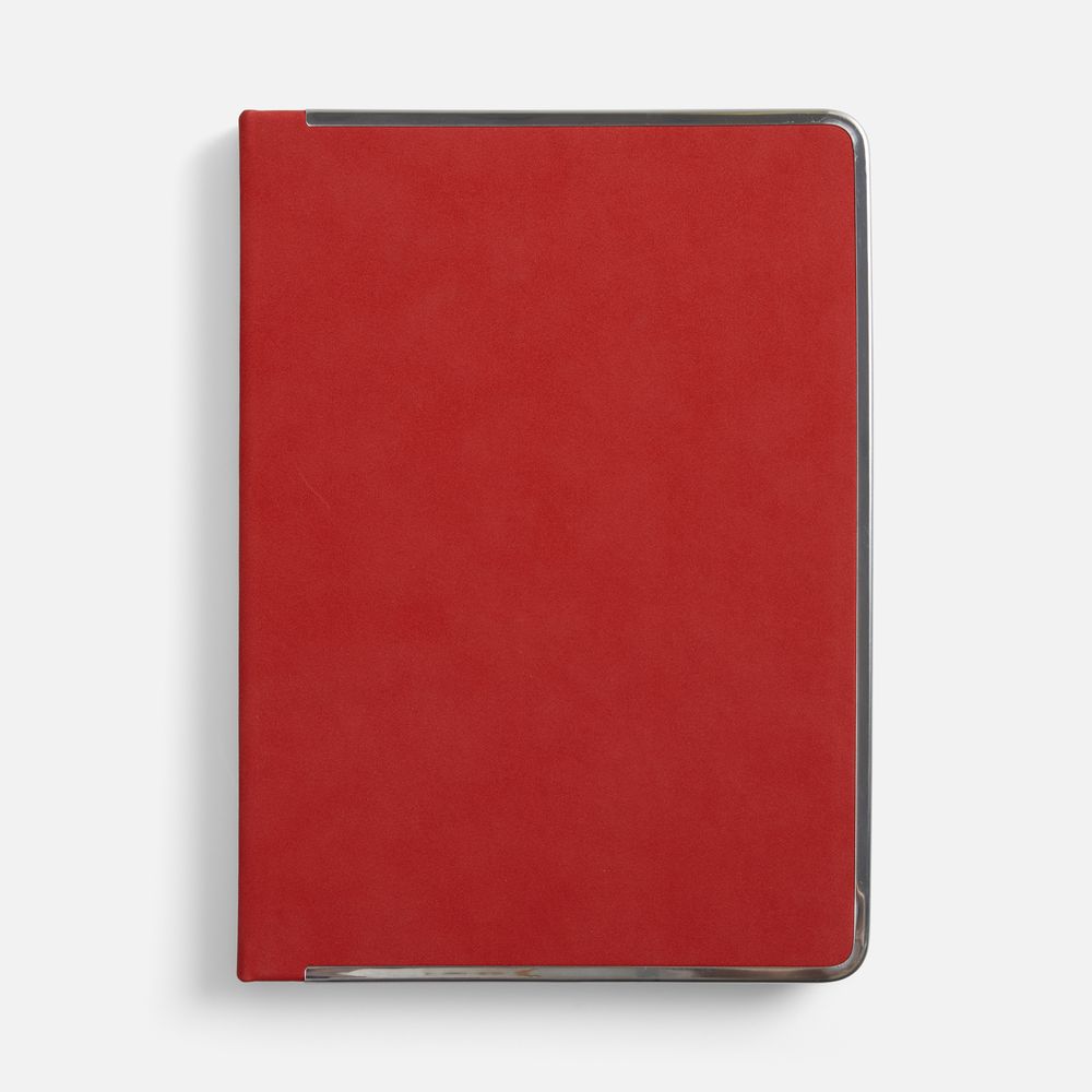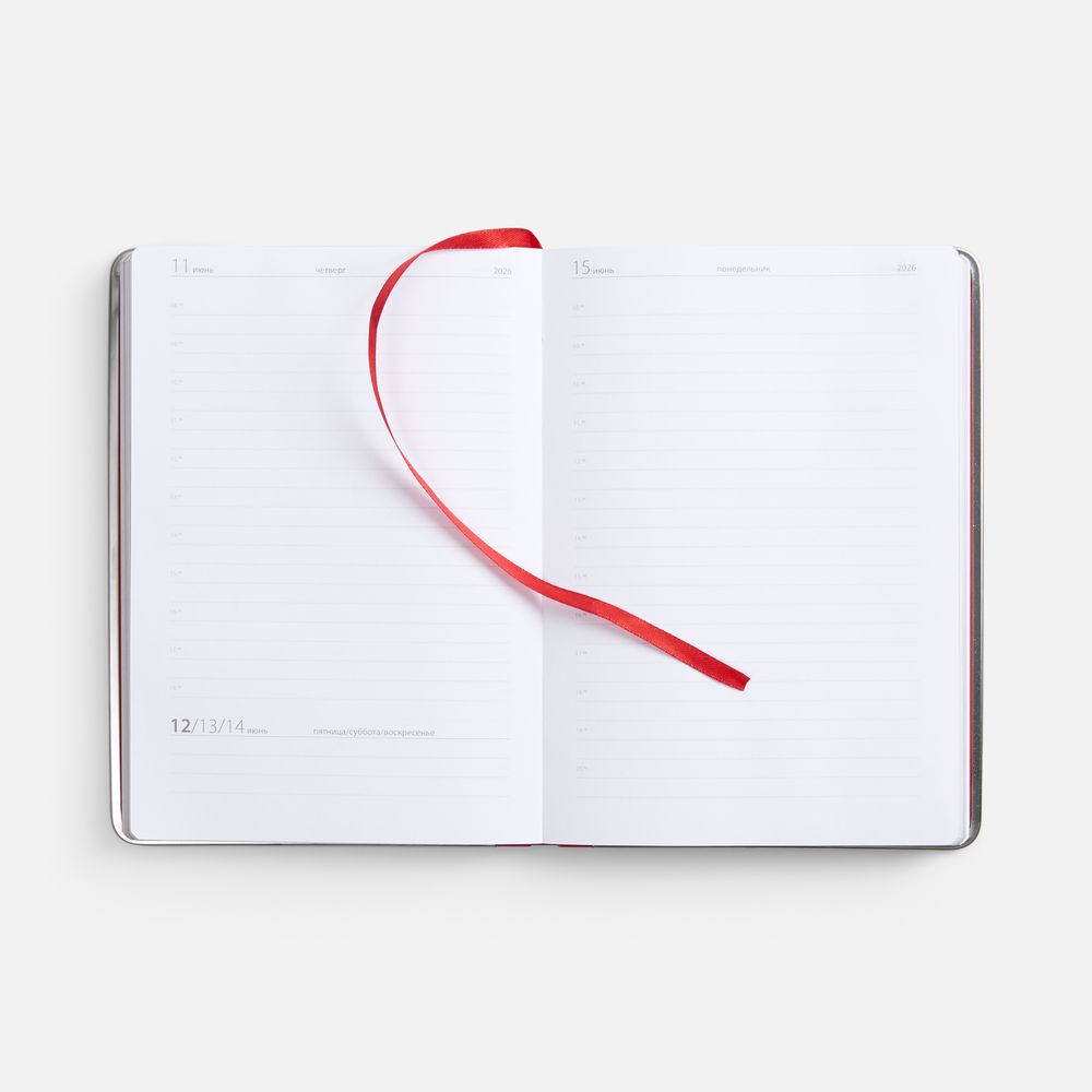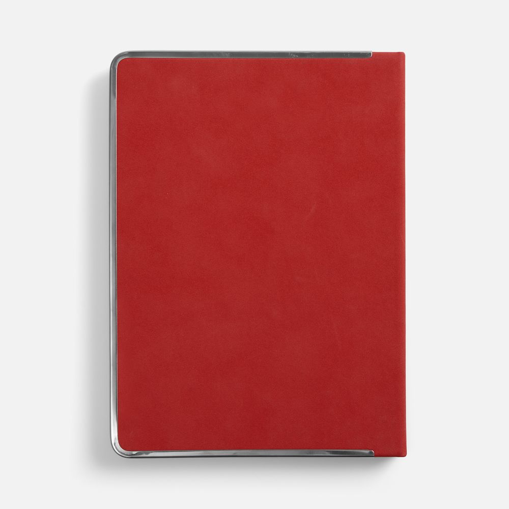 Ежедневник с твердой обложкой и серебристым  обрезом блока. Выполнен из материала Nubuck, красный РР, дополнен красным ляссе и металлическими рамками с двух сторон обложки.