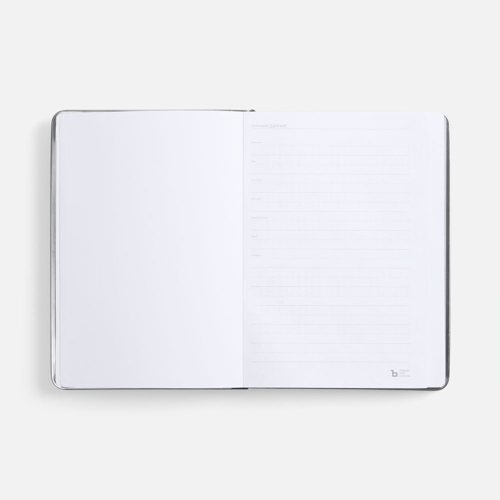 Ежедневник с твердой обложкой и серебристым  обрезом блока. Выполнен из материала Nubuck, серый СС, дополнен серым ляссе и металлическими рамками с двух сторон обложки.