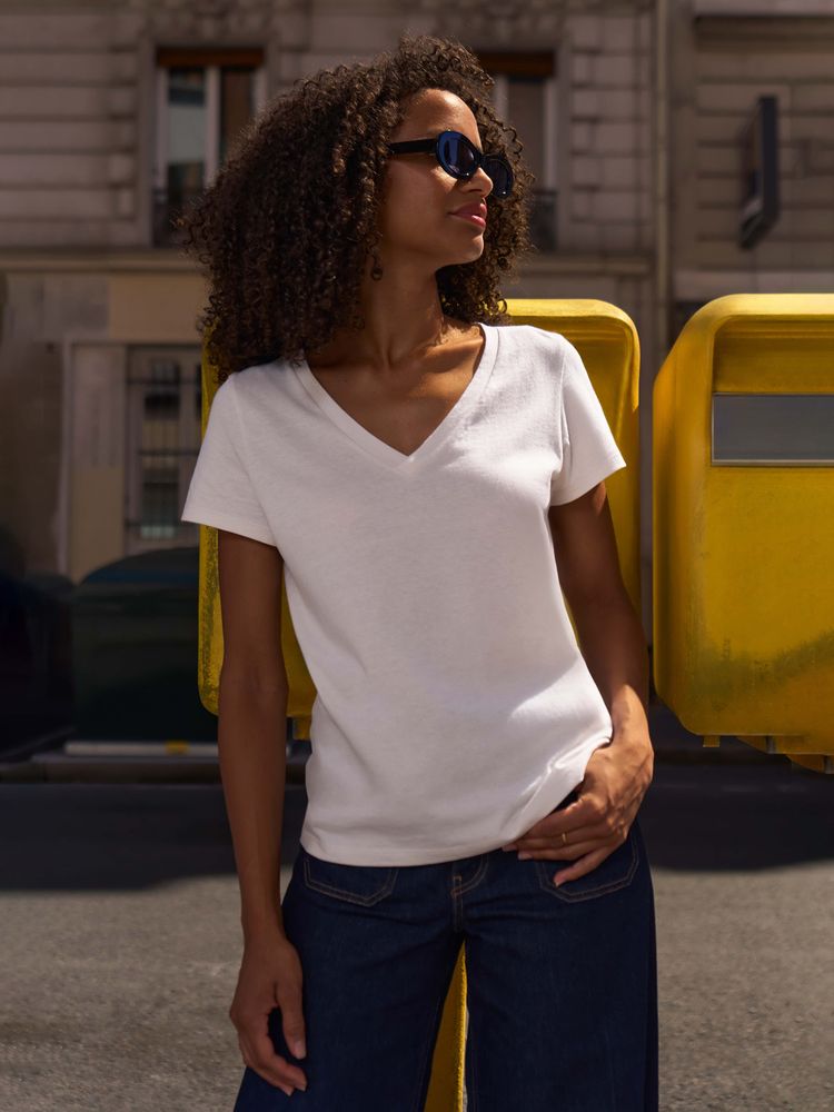 Женская футболка Regent с V-образным вырезом. Такой вырез снова актуален: он визуально удлиняет шею, подчеркивает линию ключиц и добавляет образу легкости.