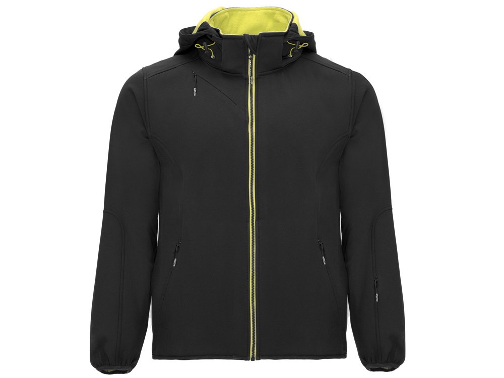 Куртка софтшелл спортивного кроя из технологичного материала * контрастная центральная молния с ветрозащитной внутренней планкой * подкладка из контрастного ультра-теплого микрофлиса * прорезной кармана на груди по диагонали справа застёгивается на потайную молнию * два боковых кармана застегиваются на потайную молнию * дополнительный карман на левом рукаве * отделка резинкой в тон по низу рукавов и изделия * капюшон складывается в воротник * технологичное полотно: водонепроницаемое, с ветрозащитой.