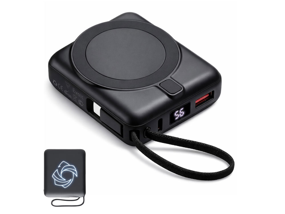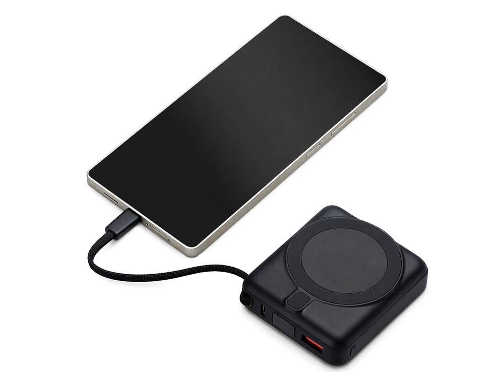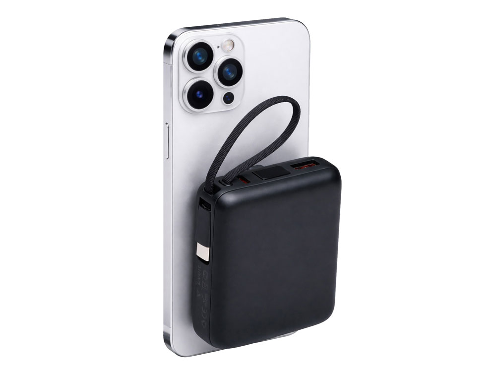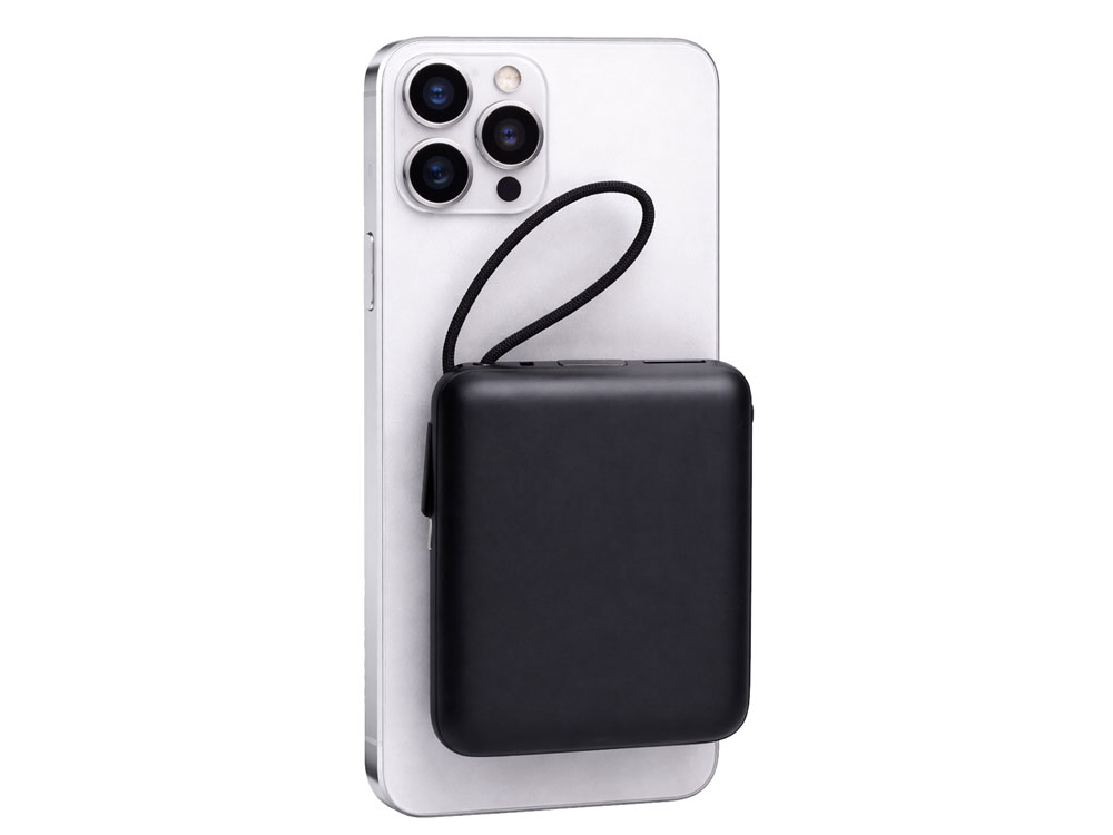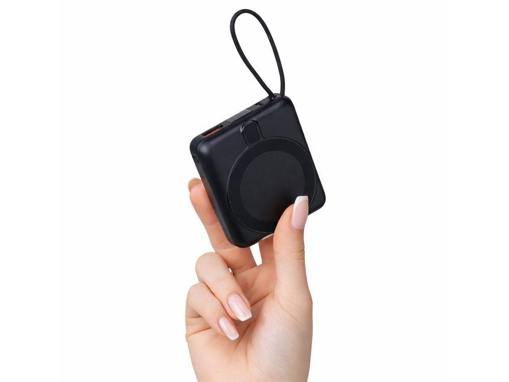 Магнитный пауэрбанк с эффектными возможностями брендирования. Компактный беспроводной аккумулятор с магнитным креплением MagSafe — идеальный корпоративный подарок для клиентов и партнеров. Уникальная особенность: логотип с подсветкой виден даже когда пауэрбанк прикреплен к телефону. Встроенный двусторонний USB-C кабель устраняет необходимость носить дополнительные провода — заряжайте устройства и сам аккумулятор одним кабелем. - Светящаяся гравировка —лого всегда на виду - Мощные магниты: надежно держится на телефоне - быстрая беспроводная зарядка + встроенный двунаправленный USB-C кабель - Универсальность: заряжает все современные смартфоны с USB-C, включая новые iPhone - Компактность: всего 6,6×7,5×2,6 см — помещается в карман, - Удобство: встроенный кабель одновременно служит петелькой для переноски