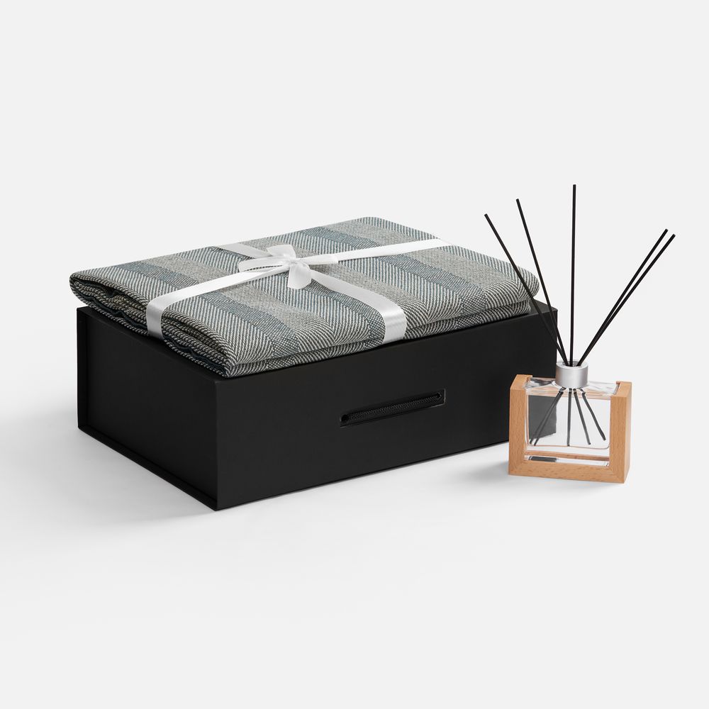 | Материал | флакон - стекло, палочки из файбера; подставка для флакона - дерево; плед - хлопок 95%, полиэстер 5%, плотность 300 г/м²; коробка - переплетный картон, бумага Malmero |