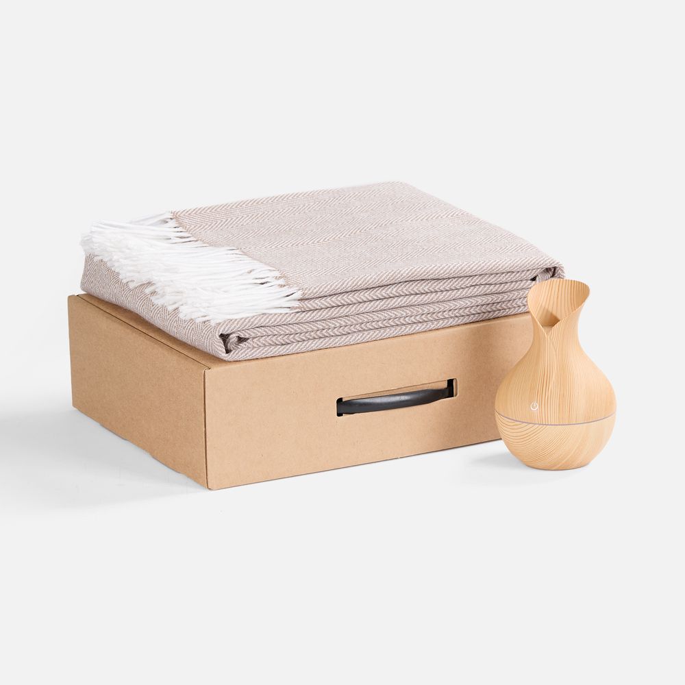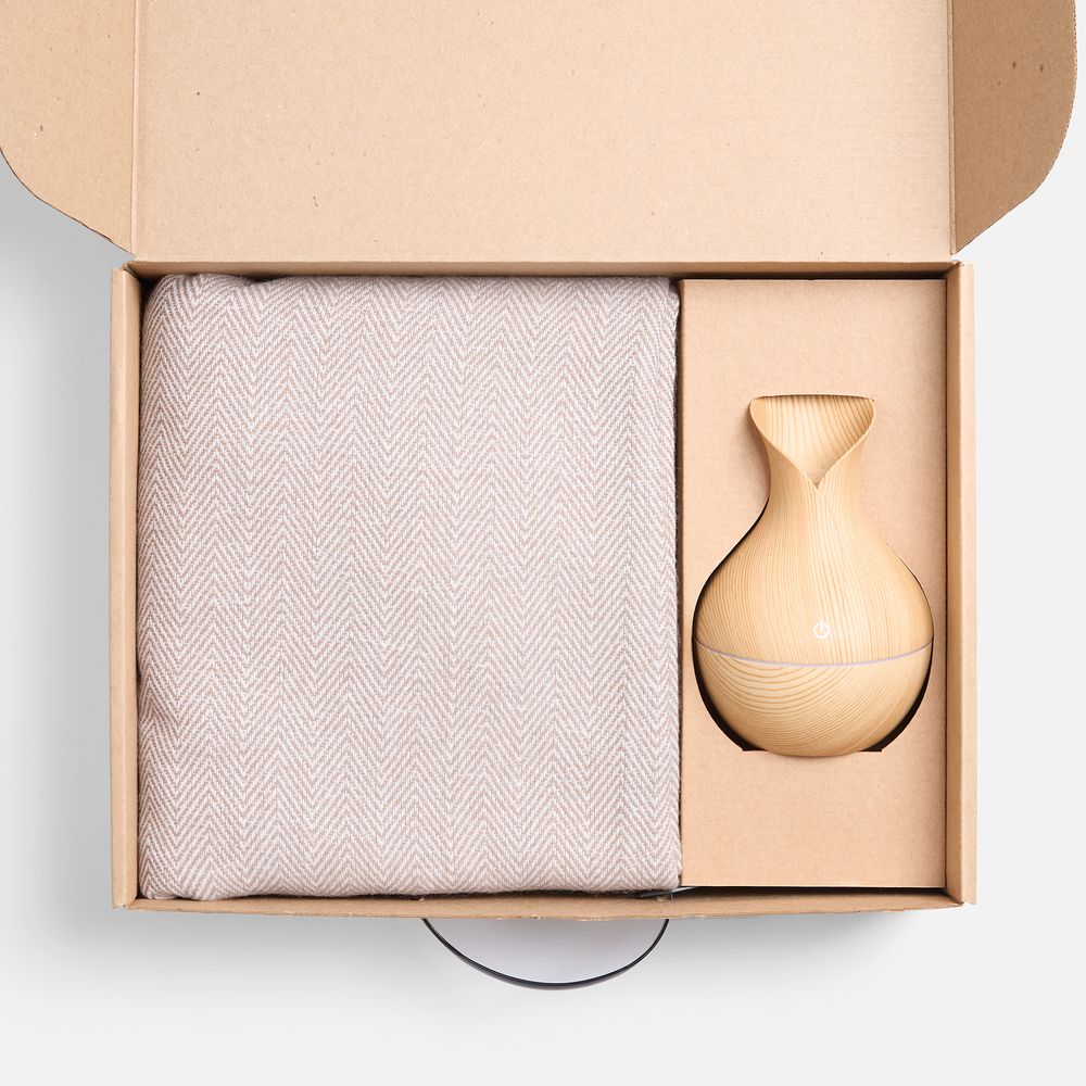 Мягкий плед нежных оттенков подарит тепло и комфорт, а изящный увлажнитель наполнит воздух свежестью и приятным ароматом. Этот набор — гармония красоты и функциональности, которая превращает каждый момент в отдых и восстановление.