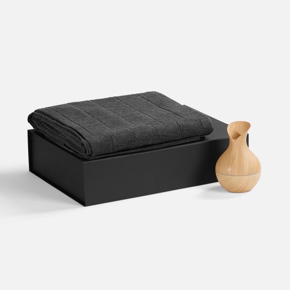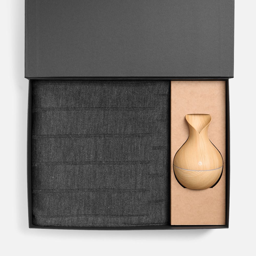 Мягкий плед с приятной текстурой приглашает расслабиться и насладиться теплом, а изящный увлажнитель-ароматизатор создает в помещении атмосферу гармонии.