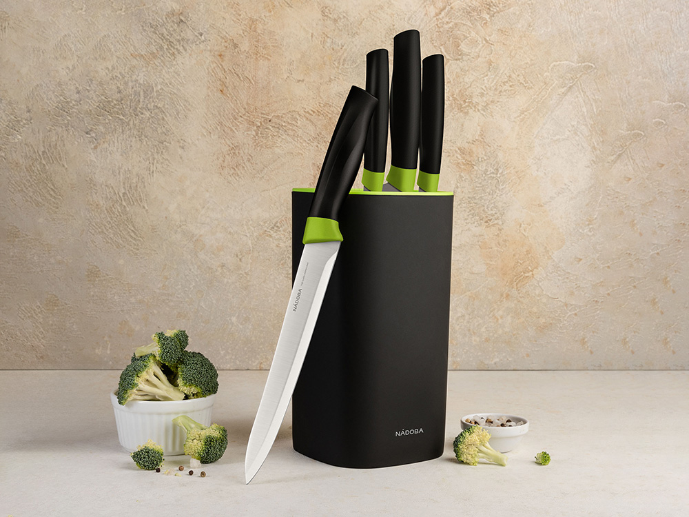 Набор ножей 5 предметов NADOBA серии Olivia состоит из: нож овощной, 9 см, нож универсальный, 12,5 см, нож разделочный, 20 см, нож поварской, 20 см и универсального блока для хранения ножей. Ножи выполнены из высококачественной нержавеющей стали с высоким содержанием углерода. Благодаря этому нож обладает высокой твердостью 52-54 HRC по шкале Роквелла и превосходными антикоррозийными свойствами. За счет пятигранного профиля и правильной толщины лезвий ножи обладают идеальным балансом и длительное время не требуют заточки. Блок нового поколения из высокопрочного пластика позволяет хранить ножи в любом количестве и произвольном порядке. Изделия можно мыть в посудомоечной машине. Гарантия на набор Olivia 5 лет.