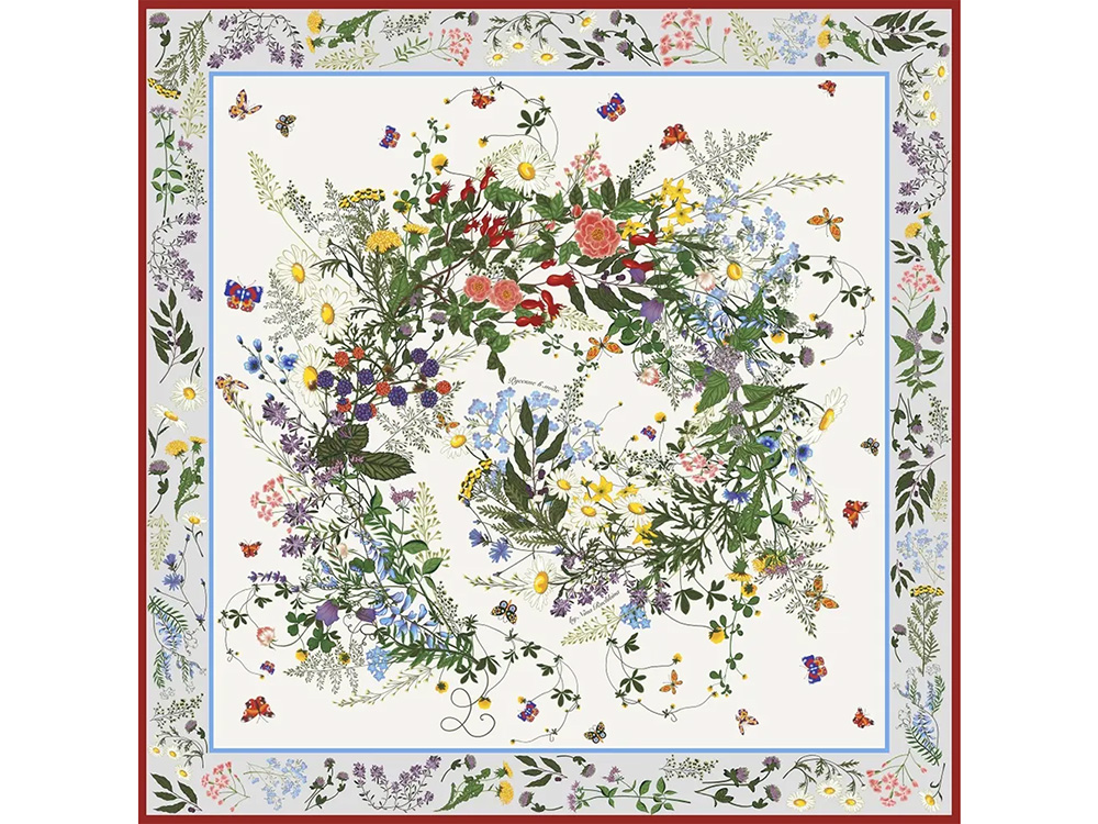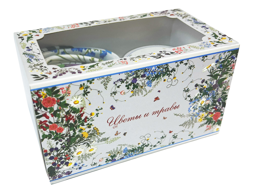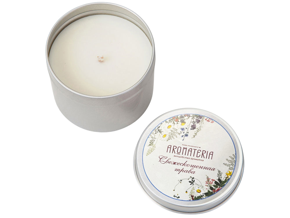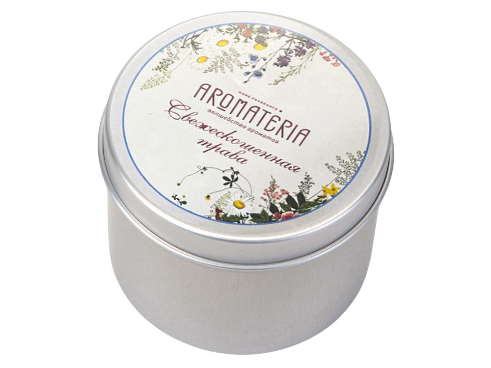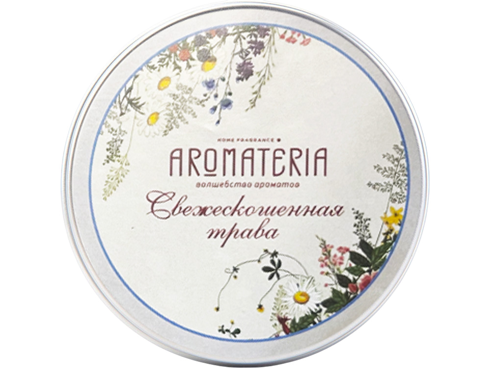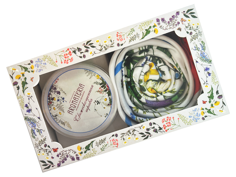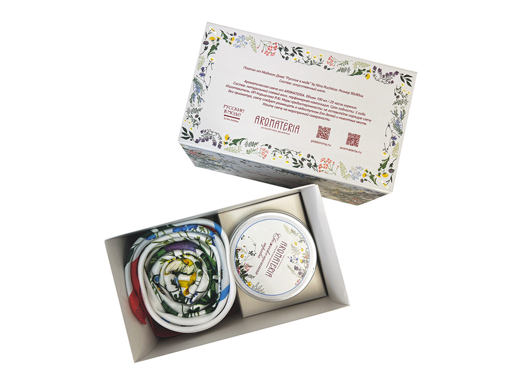Набор состоит из платка Русский полевой букет от бренда Русские в моде и ароматической свечи Ароматные травы от AROMATERIA.