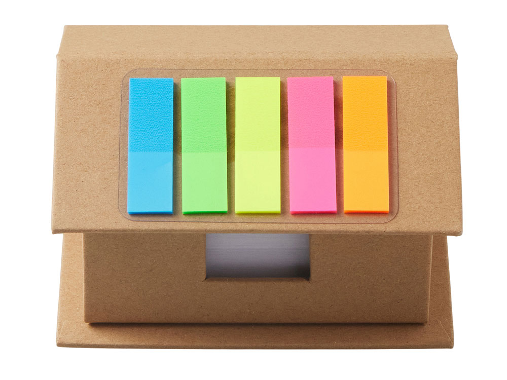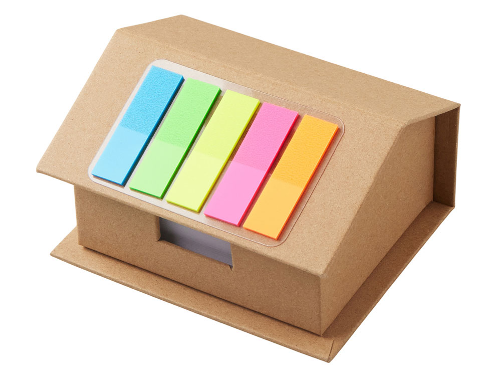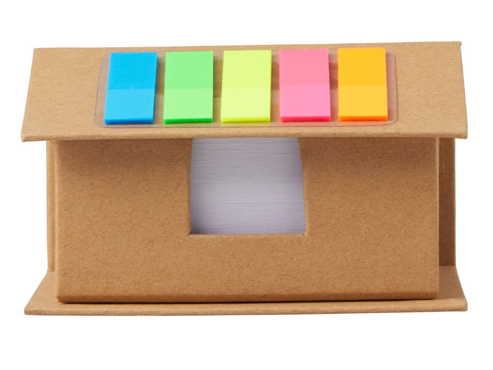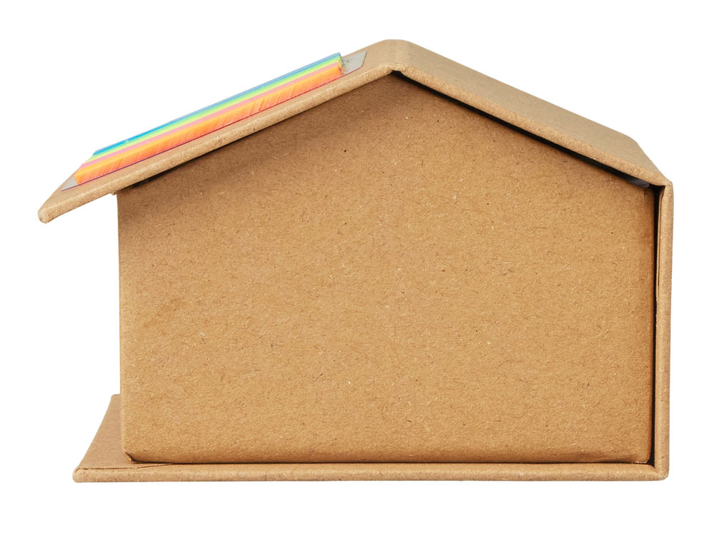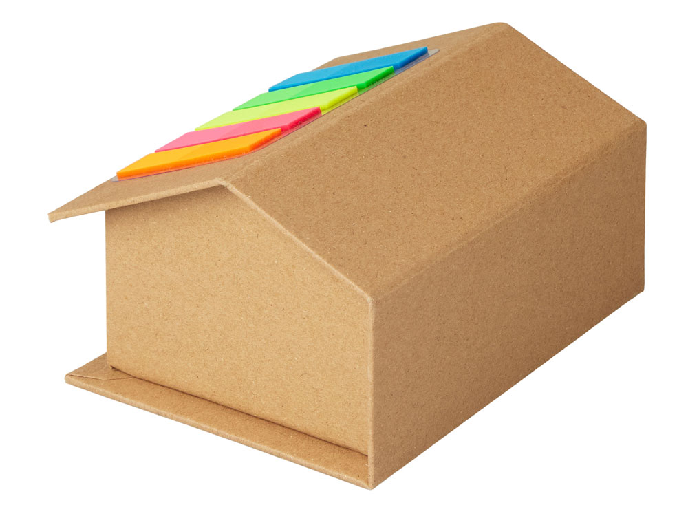 Набор стикеров и бумаг для записи в виде домика. На крыше домика расположены стикеры, 5 цветов по 25 штук каждого цвета. Внутри домика - 400 листов белой бумаги для записей плотностью 70 г/м2.