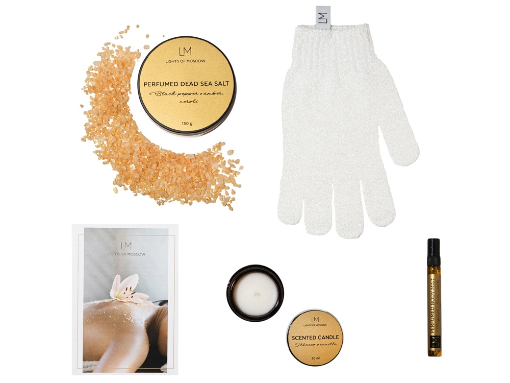 Relaxing Spa Set от Lights of Moscow подарит хорошее настроение и заряд бодрости, а также послужит полезным подарком для ваших родных, близких, друзей и коллег. SPA -набор снимет стресс, поможет восстановить внутреннюю гармонию и позволит окунуться в мир ароматов селективной парфюмерии. Каждый продукт в наборе создан по мотивам современных веяний в перфорированном искусстве. Подборка из трех топовых ароматических композиций даст возможность примерить каждый парфюм на себе, почувствовать звучание и проникнуться его настроением. Комплектность: - Подарочная брендированная коробка - 1 шт. - Ароматическая свеча, 50 мл. - 1 шт. Аромат: табак и ваниль - Парфюмированный спрей для тела, 10 мл. - 1 шт. Состав: бергамот, лимон и нейроли - Парфюмированная соль для ванны, 150 мл. - 1 шт. Состав: черный перец, амбра и нероли - Перчатка для глубокого очищения - 1 шт. - Открытка - 1 шт Условия хранения: — Свечи, аромасаше, аромадиффузоры, SPA-наборы следует хранить при температуре +18…+24 °C, вдали от источников тепла, сквозняков и прямых солнечных лучей. — Рекомендуемая влажность — не более 50%. — Избегайте длительного воздействия яркого света.