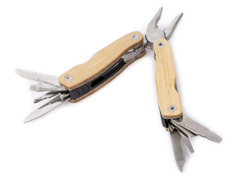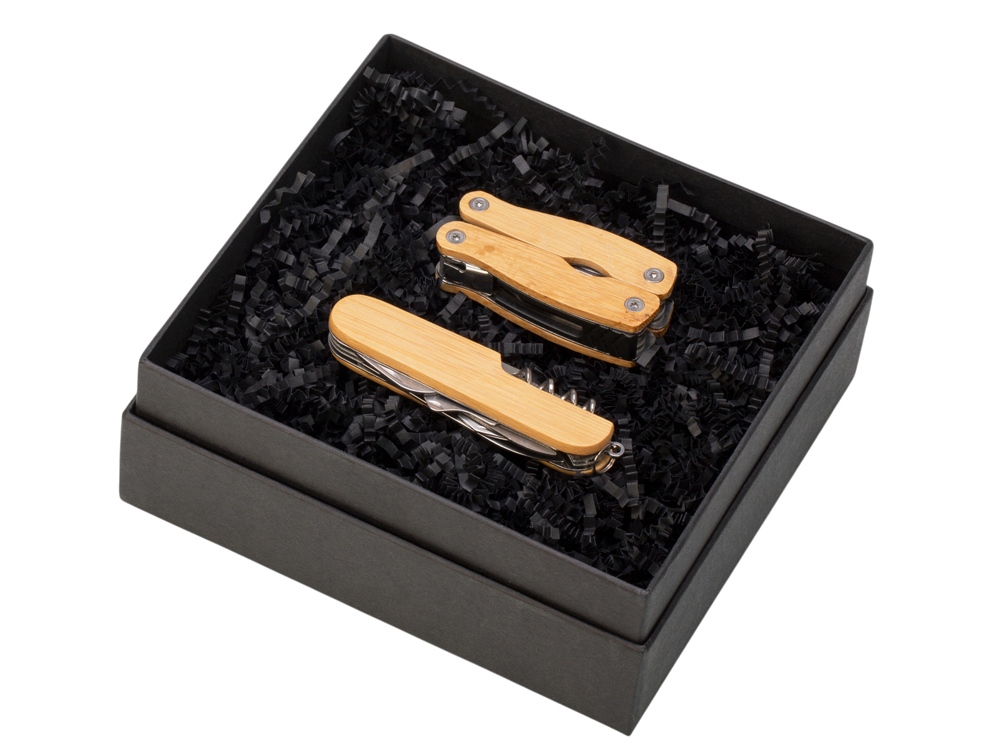 Набор состоит из двух предметов: Мультитул-нож для повседневных нужд (состоит из открывалок для банок и бутылок, плоской отвертки, пилки, штопора, ножа и ножниц); Мультитул-плоскогубцы для ремонта (состоит из плоскогубцев, открывалок для бутылок и банок, крестовой и 3-х плоских отверток, ножа, пилы по дереву и напильников по дереву и металлу). Оба мультиинструмента сочетают в себе текстуры металла и теплого натурального бамбука, благодаря чему хорошо ложатся в руку. • легкие и компактные мультитулы на все случаи жизни • мультитул-нож для повседневного ношения, мультитул-плоскогубцы для бытовых дел • качественные и долговечные материалы • подарочная коробка