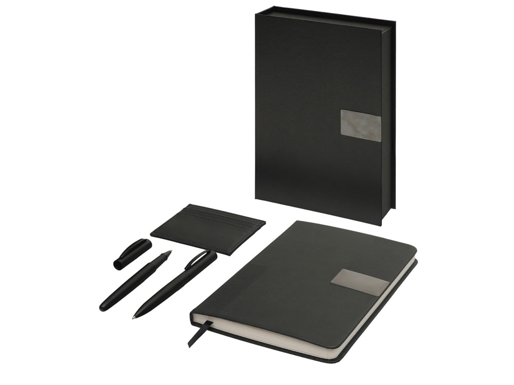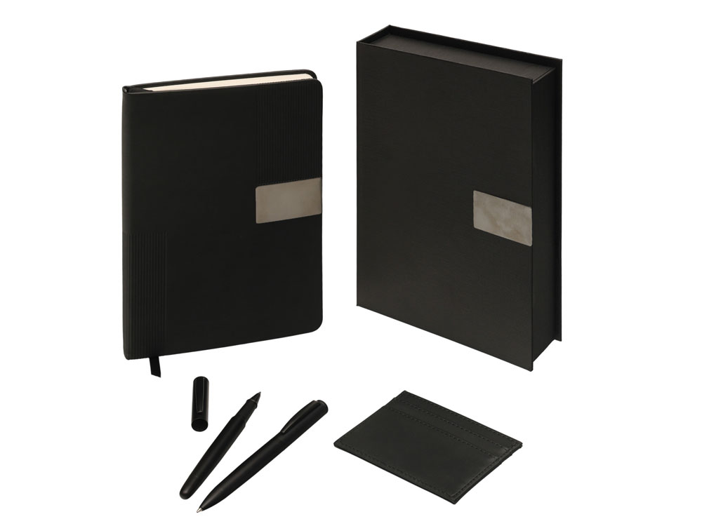 Goethe - это премиальный подарочный набор в коробке, закрывающейся на магнит. Комплект включает две ручки — шариковую и роллер — с высококачественными синими немецкими чернилами Dokumental и пишущими узлами Premec (в шариковой). Их дополняет картхолдер из экокожи на 4 карты с отделением для наличности. Завершает этот комплект блокнот в твердой обложке из искусственной кожи. Внутри него 96 листов кремовой бумаги с FSC-сертификатом плотностью 80 г/м2.