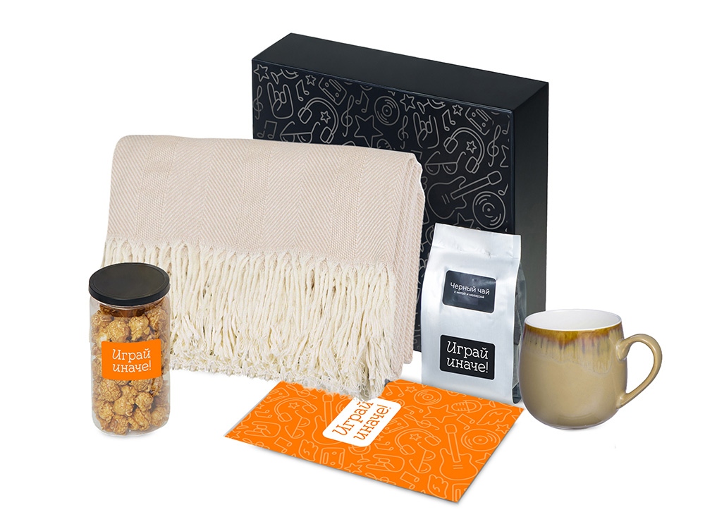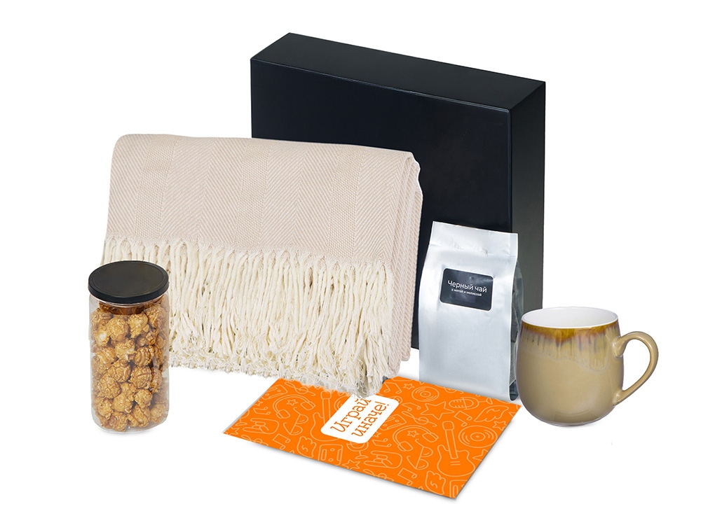| Материал товара | плед - 100% хлопок, кружка - костяной фарфор с покрытием софт-тач, чай - пластик, попкорн - пластик, металл, мешок - нетканый материал (спанбонд), коробка - картон |