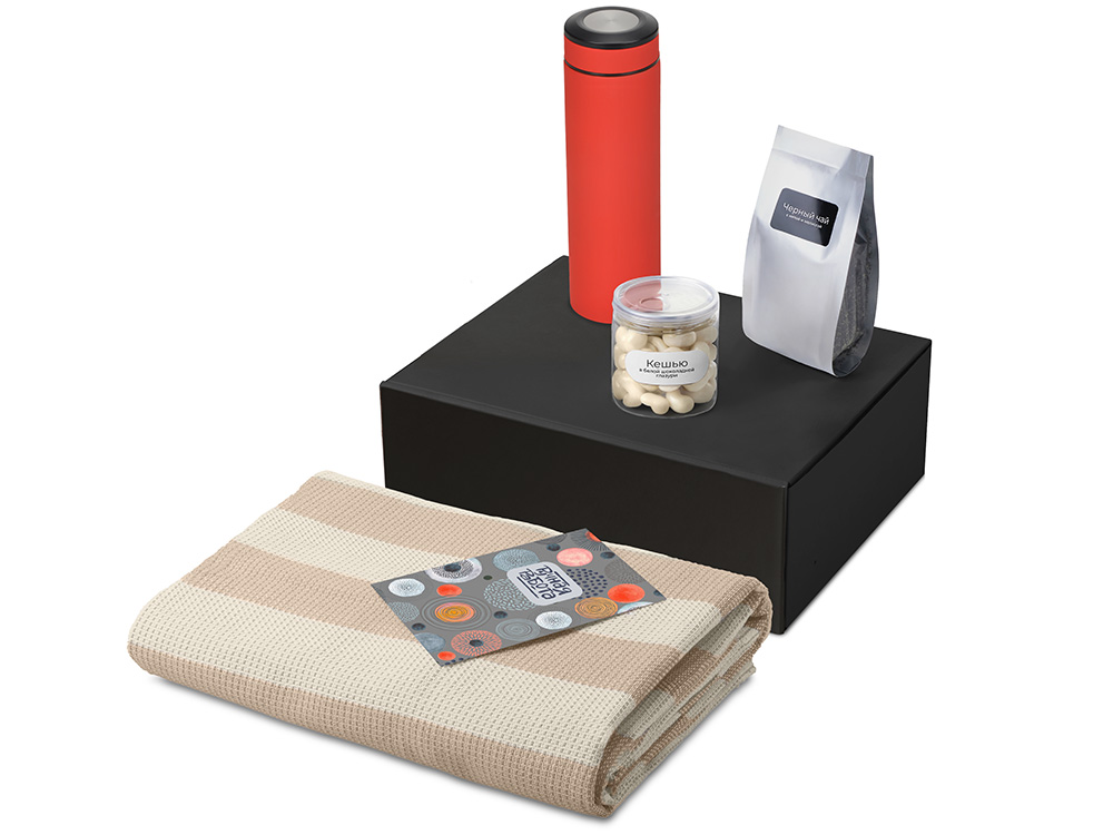 | Материал товара | плед - 100% хлопок, термос - нержавеющая сталь с покрытием софт-тач, чай - пластик, мешок - нетканый материал (спанбонд), коробка - картон |