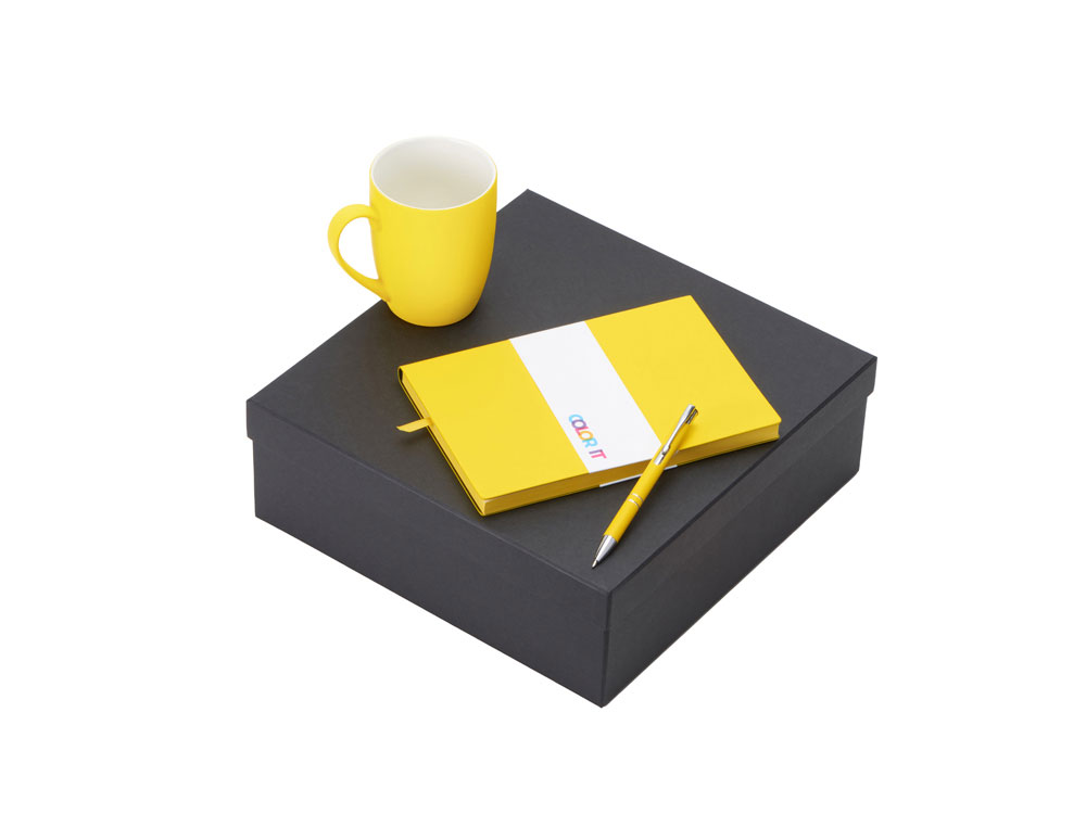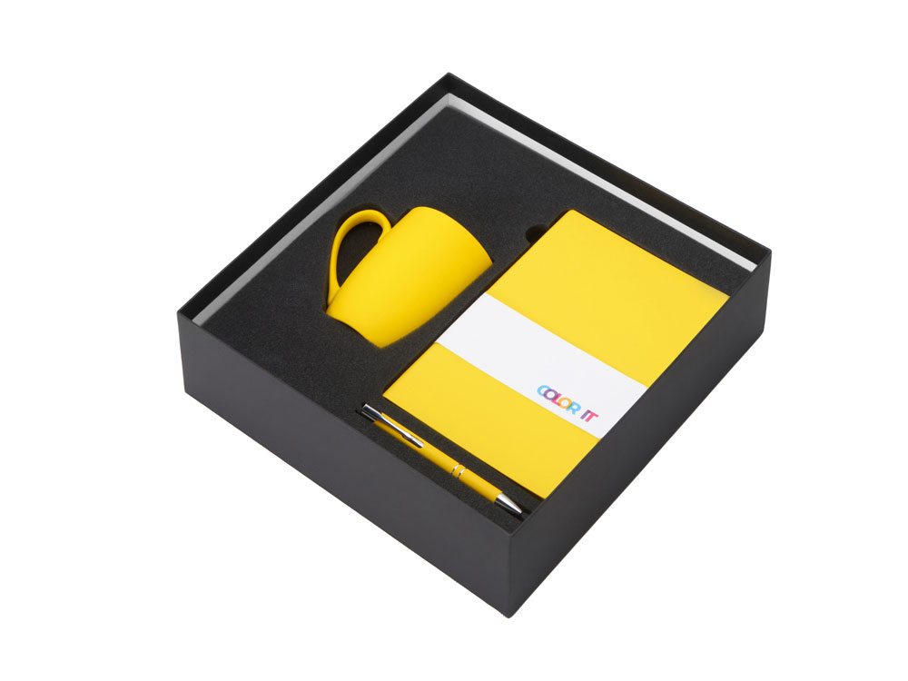 Color It — линейка, в которую входят хиты мерча в десяти самых популярных цветах. Еще никогда собрать сет под свой брендбук не было так просто. Широкая цветовая палитра серии позволяет создать идеальный набор в едином оттенке Pantone. Все товары имеют тактильно приятное покрытие софт-тач. Сет поставляется в коробке: мы продумали все, включая подарочную упаковку, за вас — осталось нанести лого! Фарфоровая кружка с удобной ручкой брендируется методом гравировки, поэтому нанесение будет долговечным и не сотрётся при мытье кружки. Бизнес-блокнот в твёрдой обложке имеет ляссе в тон обложки и среза. Бумажный блок разлинован в линейку и выполнен из бумаги, полученной из древесины из специальных восполняемых лесных ресурсов, имеет сертификат FSC. Шариковая ручка имеет сменный стержень, поэтому такой мерч прослужит дольше обычной одноразовой ручки, долго напоминая о вас клиентам. - объём кружки: 300 мл; - блокнот А5 128 листов; - ручка с необычным слайдером; - подарочная упаковка из картона, оклеенного дизайнерской бумагой уже включена в набор