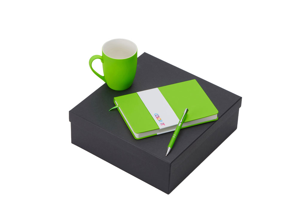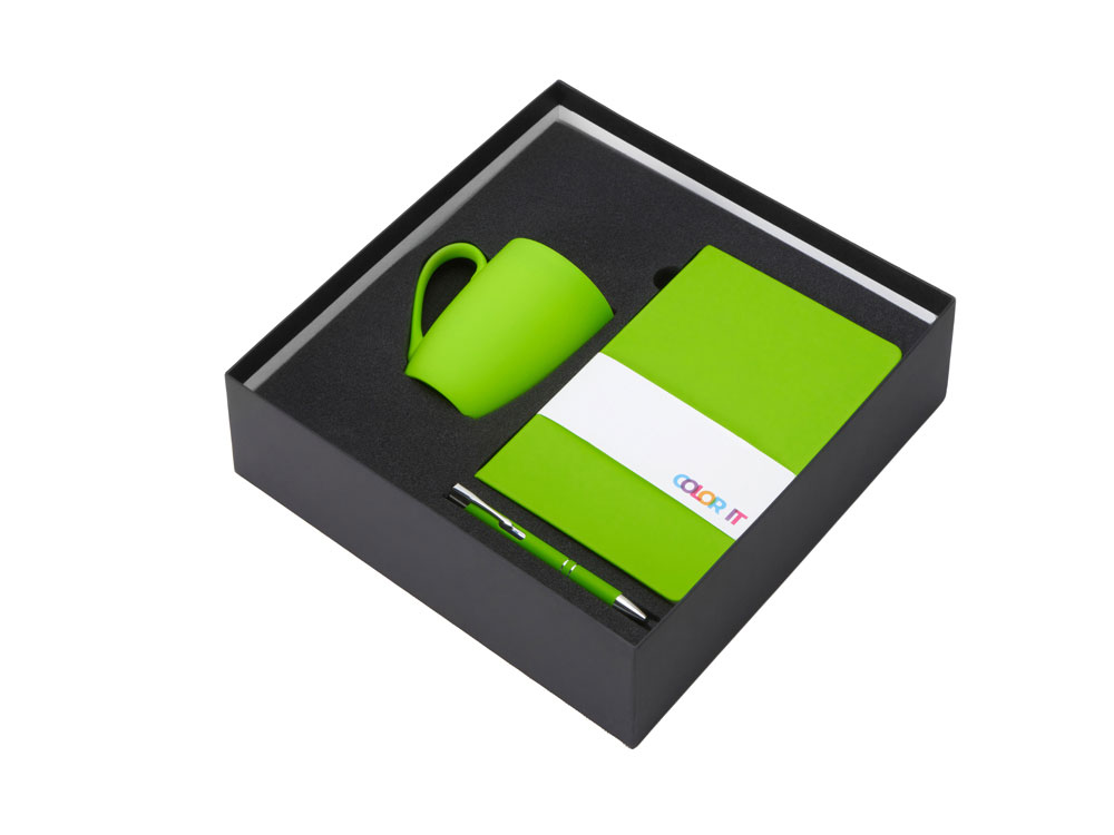 Color It — линейка, в которую входят хиты мерча в десяти самых популярных цветах. Еще никогда собрать сет под свой брендбук не было так просто. Широкая цветовая палитра серии позволяет создать идеальный набор в едином оттенке Pantone. Все товары имеют тактильно приятное покрытие софт-тач. Сет поставляется в коробке: мы продумали все, включая подарочную упаковку, за вас — осталось нанести лого! Фарфоровая кружка с удобной ручкой брендируется методом гравировки, поэтому нанесение будет долговечным и не сотрётся при мытье кружки. Бизнес-блокнот в твёрдой обложке имеет ляссе в тон обложки и среза. Бумажный блок разлинован в линейку и выполнен из бумаги, полученной из древесины из специальных восполняемых лесных ресурсов, имеет сертификат FSC. Шариковая ручка имеет сменный стержень, поэтому такой мерч прослужит дольше обычной одноразовой ручки, долго напоминая о вас клиентам. - объём кружки: 300 мл; - блокнот А5 128 листов; - ручка с необычным слайдером; - подарочная упаковка из картона, оклеенного дизайнерской бумагой уже включена в набор