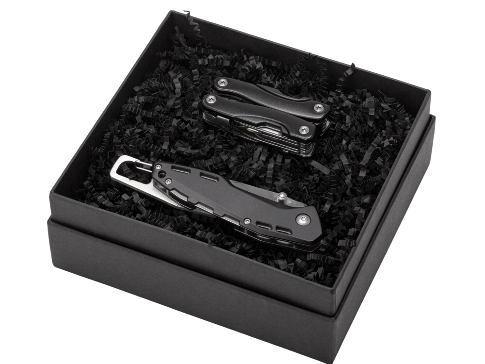 Подарочный набор, который точно придется по душе мастерам на все руки. Мультиинструмент - незаменимая вещь в ремонте, а особенно в дороге. Компактный размер и небольшой вес мультитула позволяют брать его с собой. Складной нож оснащен блокиратором от случайного закрывания, что делает его безопасным в работе. В рукоять ножа также встроены отвертка, нож для ремня безопасности и серрейтор. Карабин позволяет прикрепить нож к рюкзаку или поясному ремню, чтобы обеспечить наиболее удобный и быстрый доступ к инструменту. • нож и мультитул выполнены из антикоррозийной стали • мультитул имеет собственный чехол, который также можно брендировать; • подарочная упаковка набора входит в комплект, - вам осталось только придумать принт!