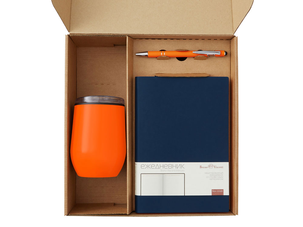 Материал товара ежедневник - искусственная кожа, термокружка - нержавеющая сталь снаружи, полипропилен внутри, ручка - металл c покрытием софт-тач, ситечко - нержавеющая cталь