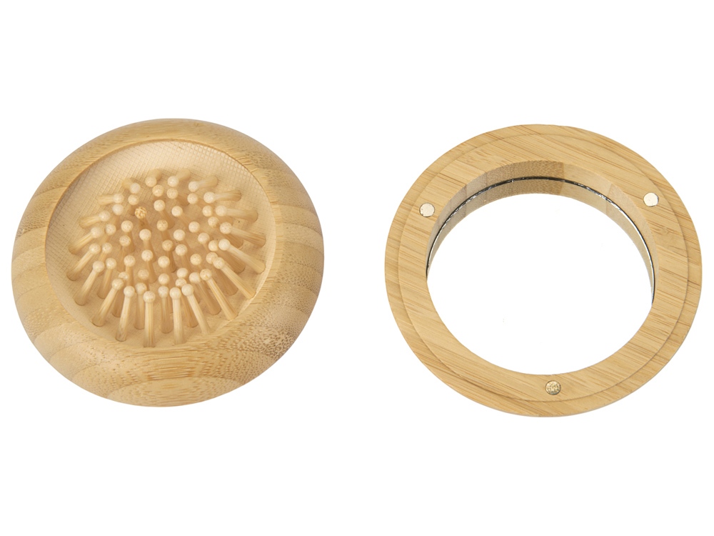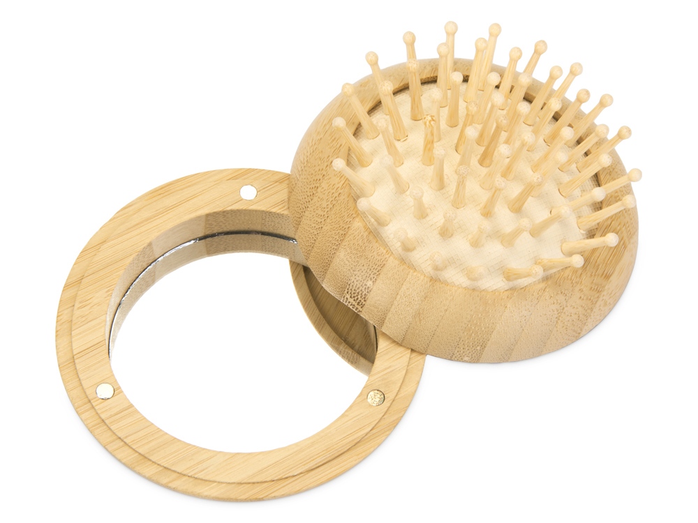 Косметический набор 2-в-1: расчёска и зеркальце. С этим набором можно поправить причёску или макияж практически на ходу! Благодаря небольшому размеру Daisy уместится не только в дамской сумочке, но и в обычном кармане! Удобный формат расчёски позволит быстро привести себя в порядок в любом месте, избавляя от необходимости искать зеркало. Корпус расчёски изготовлен из экологичного бамбука. - практичный женский набор; - натуральный бамбук; - компактный размер.
