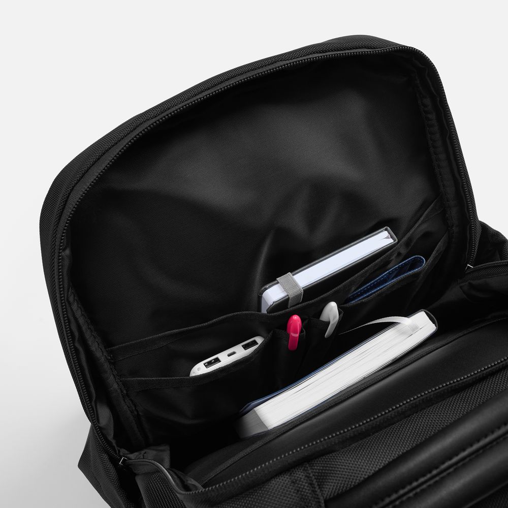 Специальное отделение на молнии с мягкими стенками надежно фиксирует ноутбук, защищая его от ударов и повреждений во время переноски. Основное отделение оснащено удобной панелью‑органайзером, позволяющей структурированно разместить документы и другие необходимые предметы.