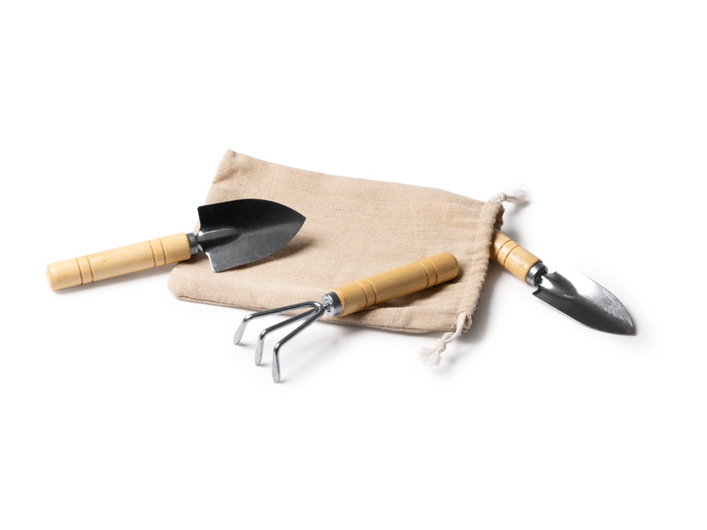 Садовый набор из 3 аксессуаров из нержавеющей стали с бамбуковыми ручками. Включает большую и малую лопатки и грабли. В комплект входит хлопковый мешочек.