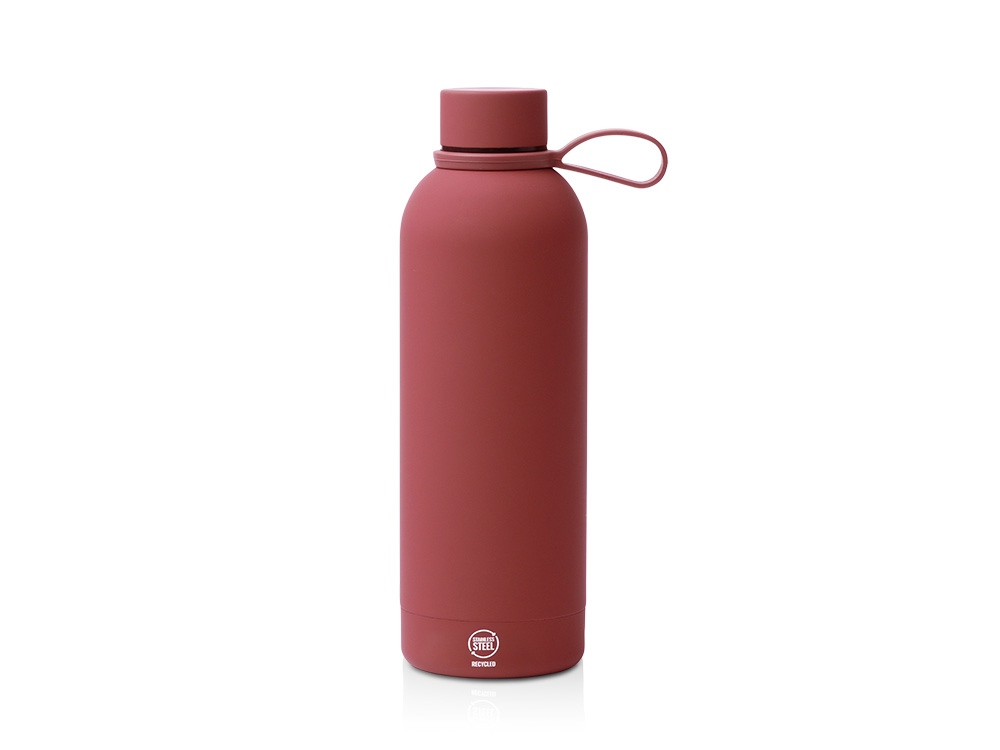 Термобутылка из переработанной нержавеющей стали 304. Мягкая прорезиненная поверхность на корпусе. Удобная силиконовая ручка для переноски. Оснащена противокапельной системой благодаря силиконовому кольцу, встроенному во внутреннюю часть крышки. Крышка и ручка соответствуют цвету корпуса. Объем: 500 мл. - Переработанная нержавеющая сталь 304 - Защита от капель - Нельзя мыть в посудомоечной машине - Поставляется в эко коробке