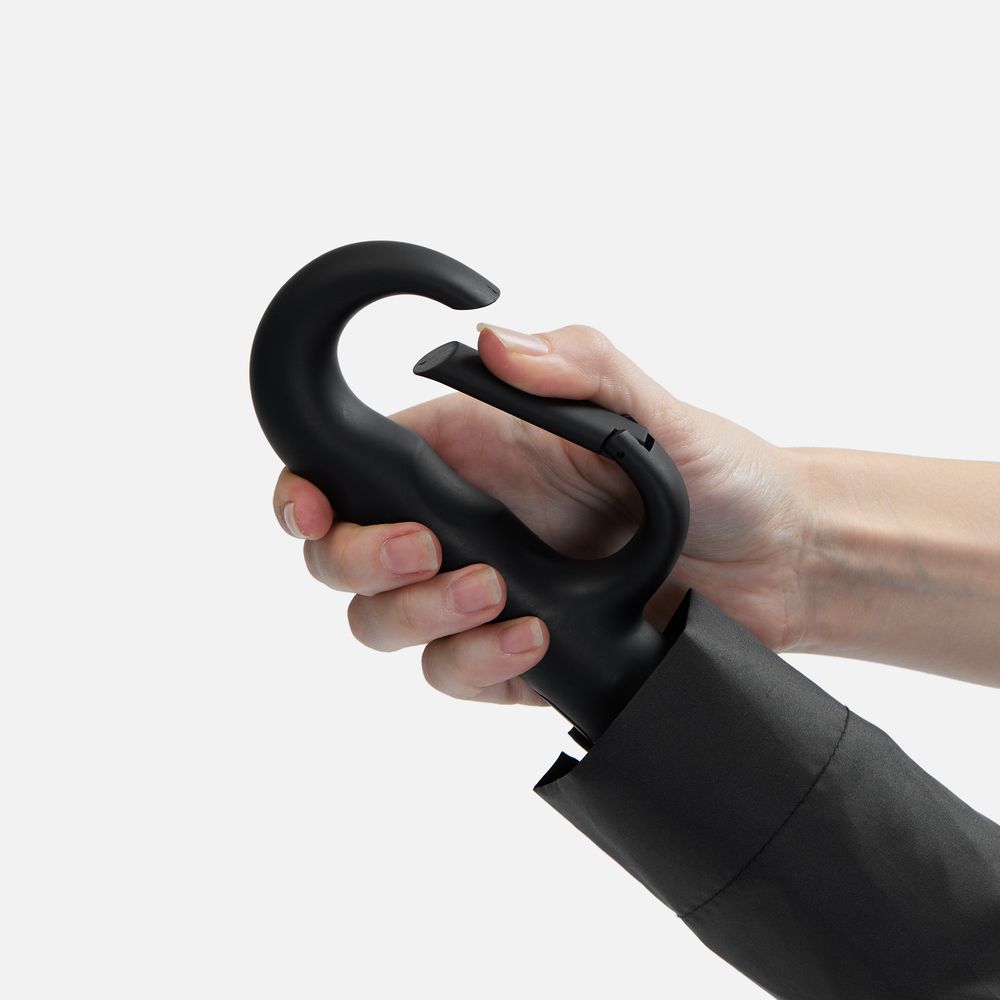 Преимущество обратного сложения заключается в том, что при закрытии внутренняя поверхность зонта остается снаружи, а мокрая сторона — запаковывается внутрь. За ручку-карабин удобно подвесить зонт на рюкзак или сумку.